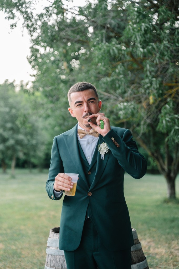 Franck, de son cÎté, profitait de ses derniers instants de calme avant de retrouver celle qui allait devenir sa femme. Le regard un peu ému, mais le sourire bien présent.